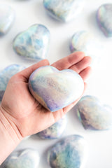 These unique blue calcite angel aura crystals were hand-selected, cleared and infused with Reiki energy to amplify their energy. Hold the stone over your throat as you let it absorb and transmute your fears away and allow communication to flow without judgment.