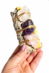 Prepare Your Tools. Carefully cut the threads binding the bundle to separate the sage, Palo Santo, and crystals. The crystals are not made to burn; keep them aside for meditation or intention-setting.